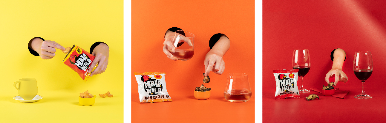 Launching of Mala snacks in Singapore, the brand direction was to keep the photos lifestyle, relatable and trendy. A series of photos were created in the 3 color scheme that translate to the products spicy level of yellow, orange and red.