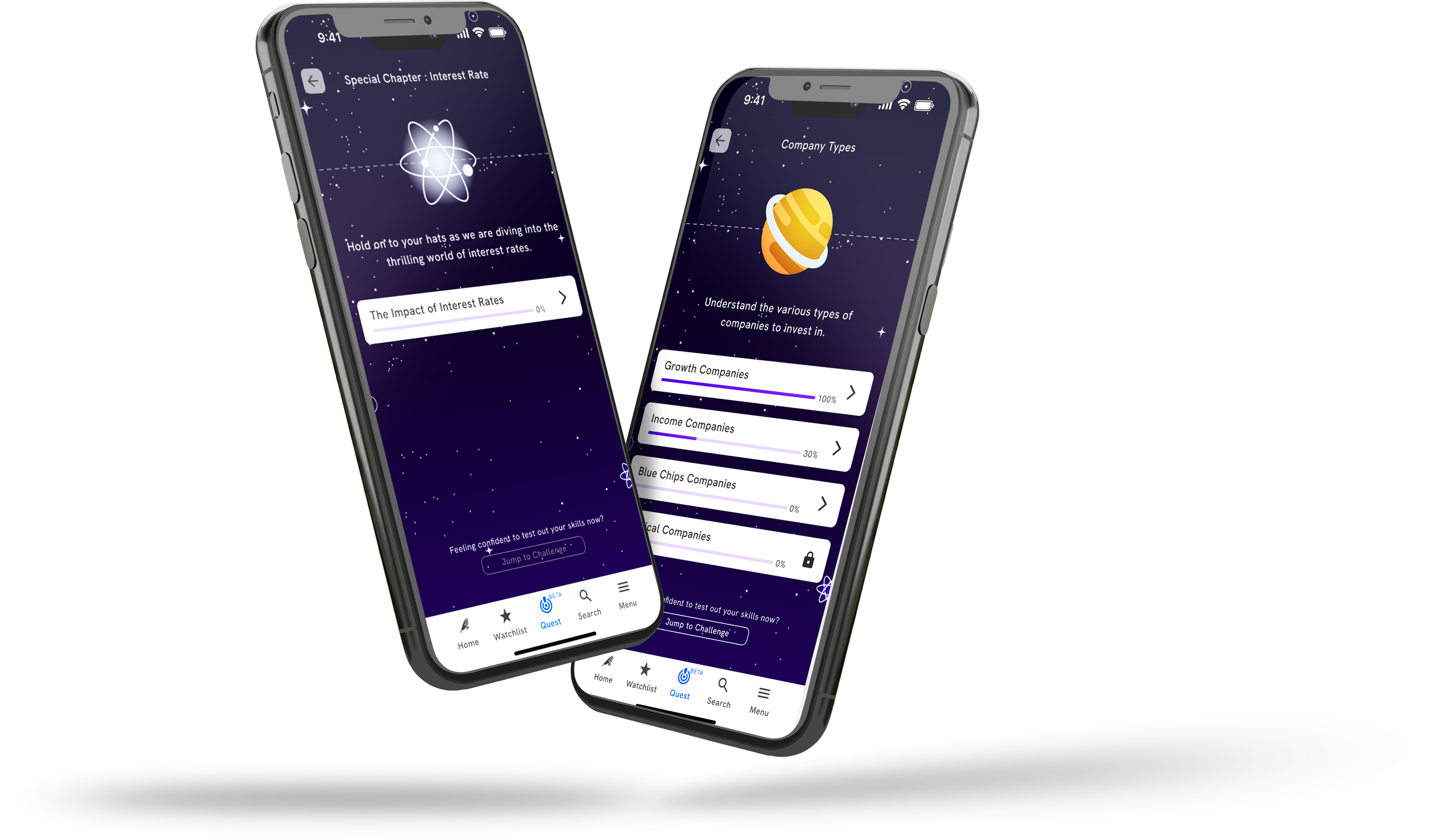 The quest feature creates a learning space zone where each lesson is represented as a planet, and each planet includes 5–7 modules. A distinct purple color scheme is used to communicate learning within the app.