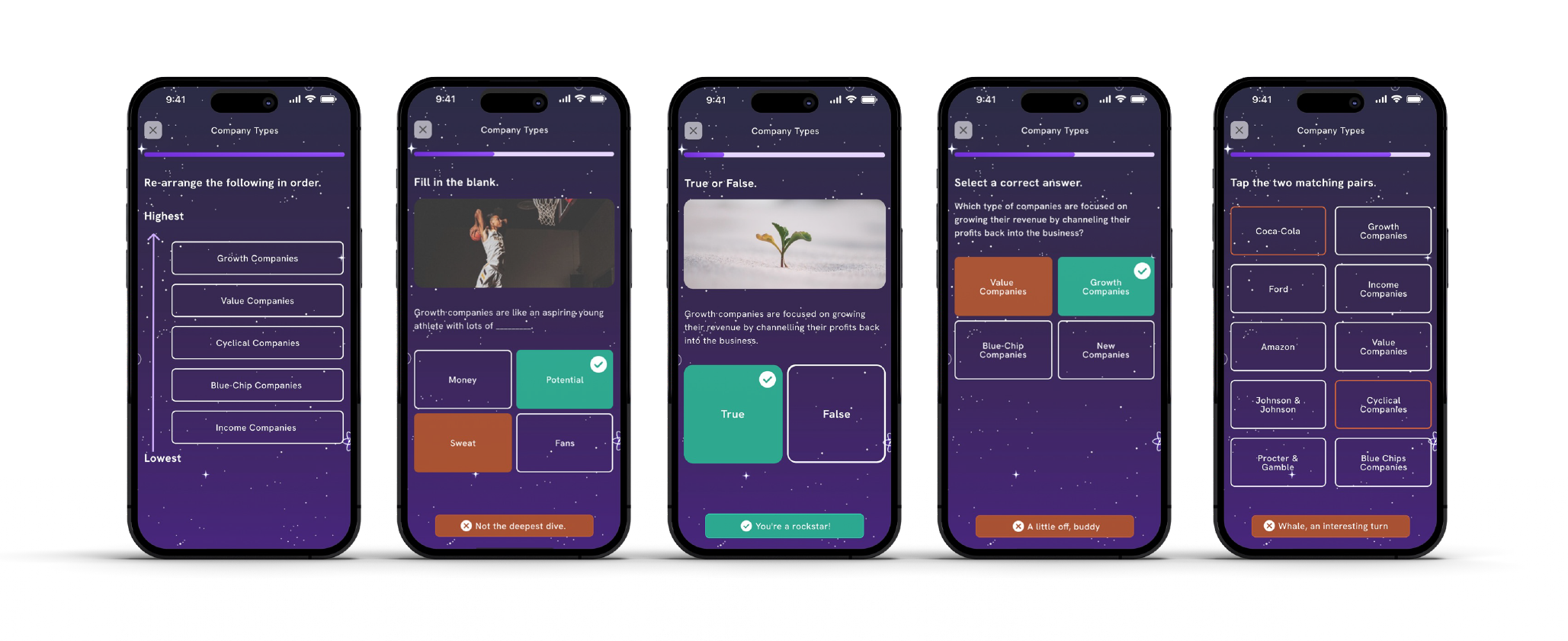To keep users engaged, quizzes are introduced in five different variations. Haptic notifications with sounds and vibrations are incorporated to stimulate user senses.