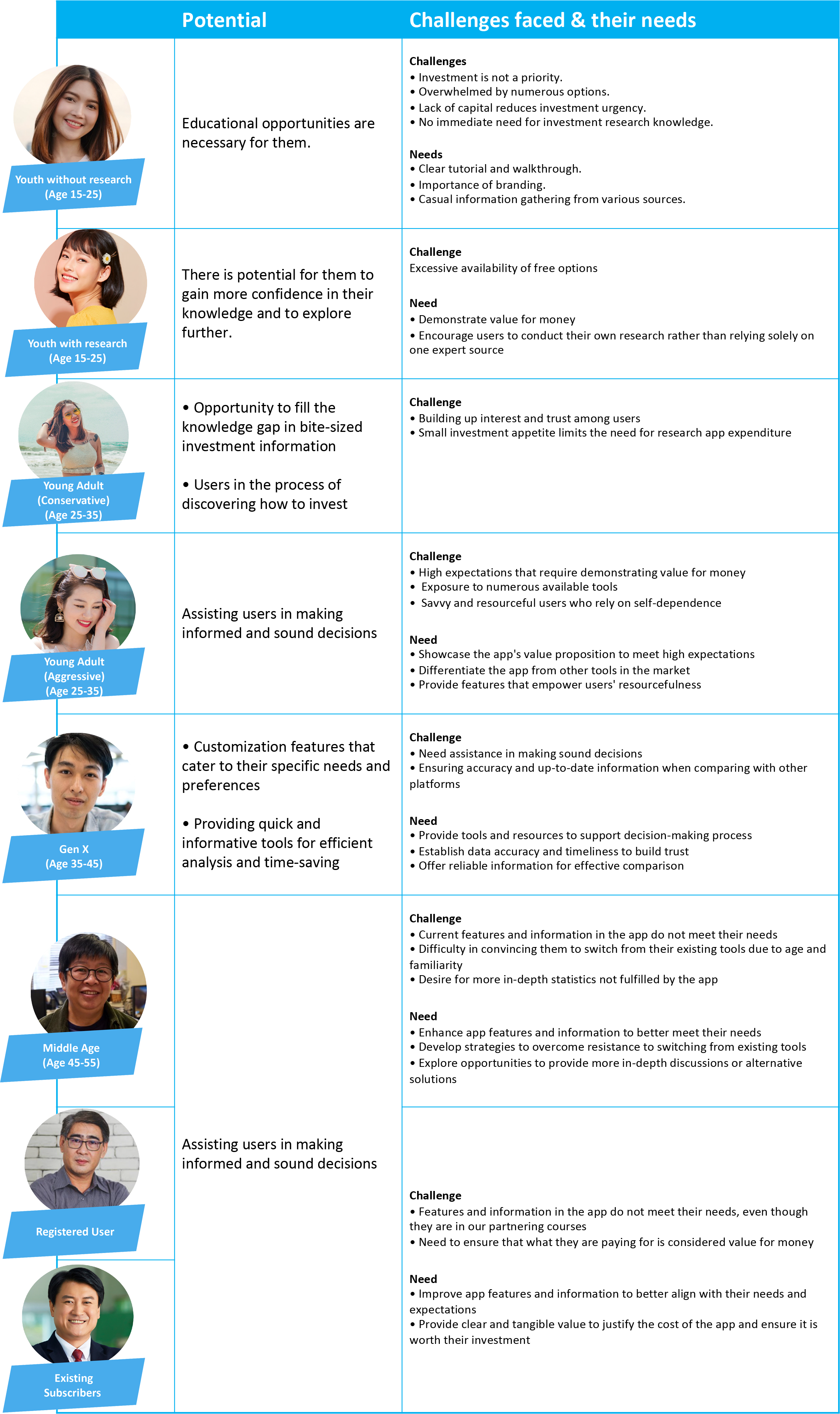 In conclusion, our research has provided valuable insights into various personas, allowing us to tailor our app to meet their specific needs and goals. With a particular focus on the youth and young adults, we aim to capture their interest, provide value, and effectively compete in the market. Our findings have also emphasized the importance of establishing ourselves as a credible investment research provider and assisting users in making informed decisions.