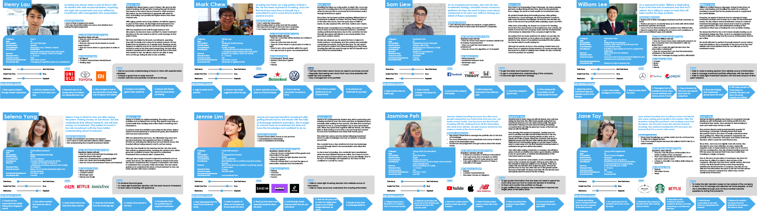 To gather unbiased opinions, users were recruited through surveys distributed via email to our existing database, as well as various public groups. The recruitment process involved targeting participants based on factors such as age group, income, investment commitment level, investment experiences, risk appetites, hours spent on researching, and the number of annual trades made. From a total of 264 surveys, 47 participants were selected for one-on-one private interviews. These interviews proved valuable in defining and categorizing the user base into 8 distinct personas.