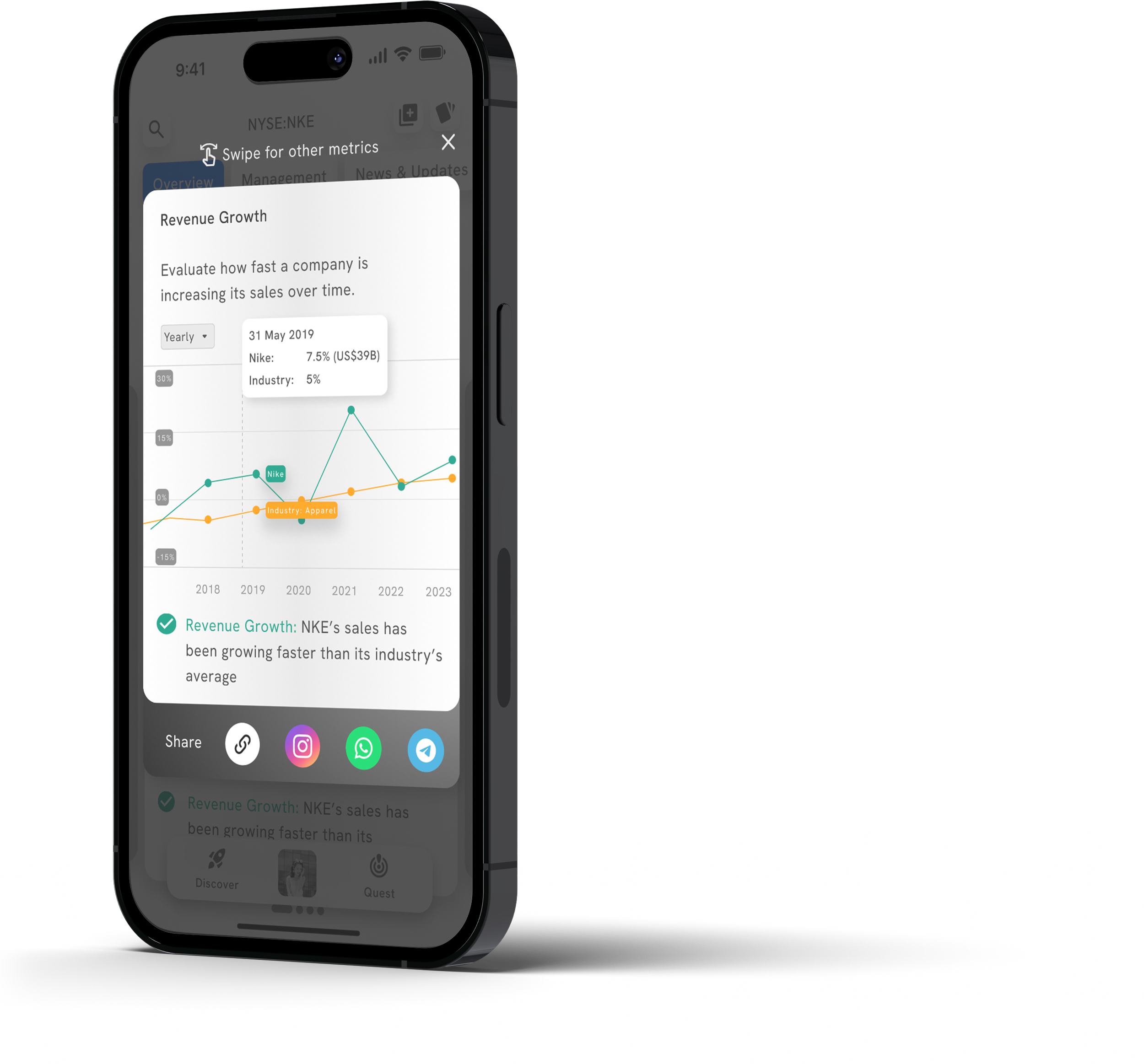 Each chart and data point is shareable across platforms, helping users engage friends and communities in their investing journey.